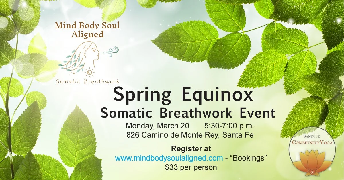 Spring Equinox Somatic Breathwork Event Monday, March 20, 2023 5:30 PM 7:00 PM 17:30 19:00 826 Camino de Monte Rey, Suite B1 Santa Fe, New Mexico 87505 (map) Google Calendar ICS Register for this event at mindbodysoulaligned.com